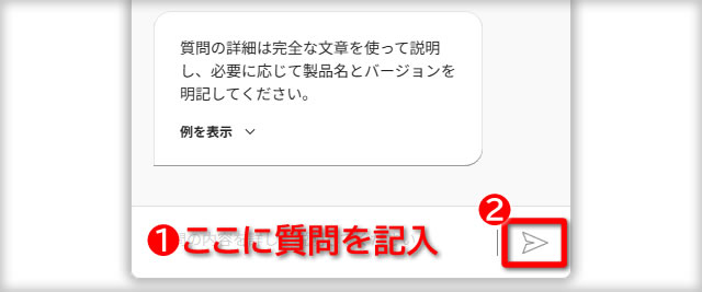 AIによる回答の精度を上げるには、発生しているトラブルや質問したい内容に加え、製品名、アップデートバージョン、エラーメッセージを正確に入力するのが良いようです。